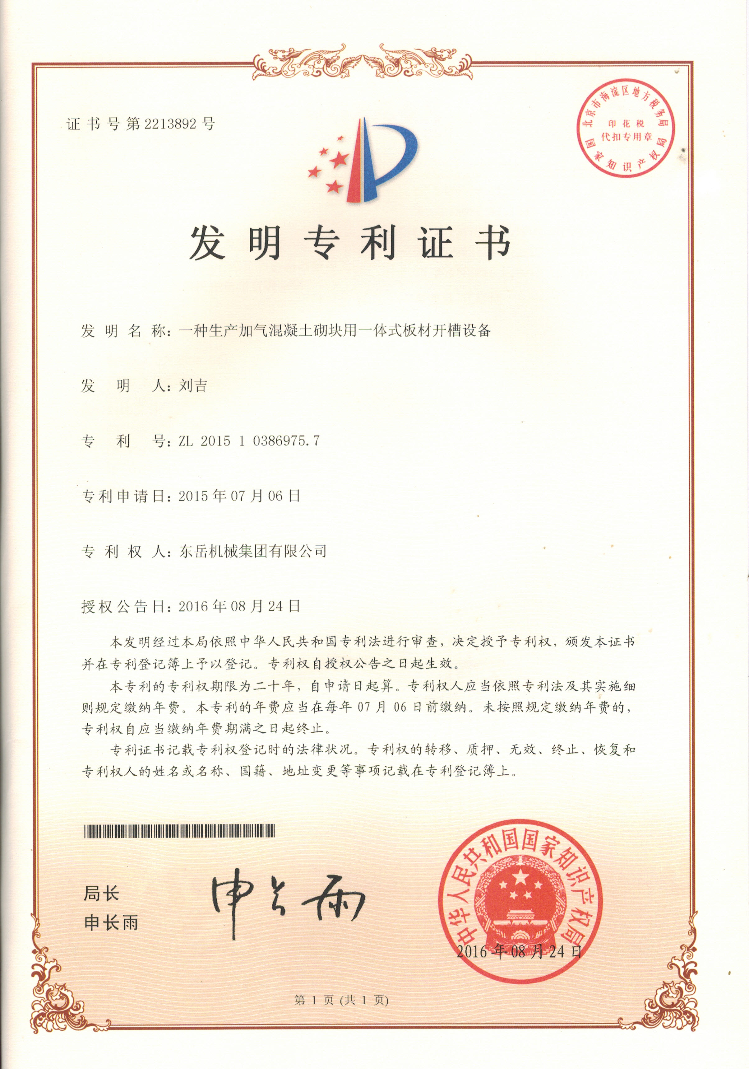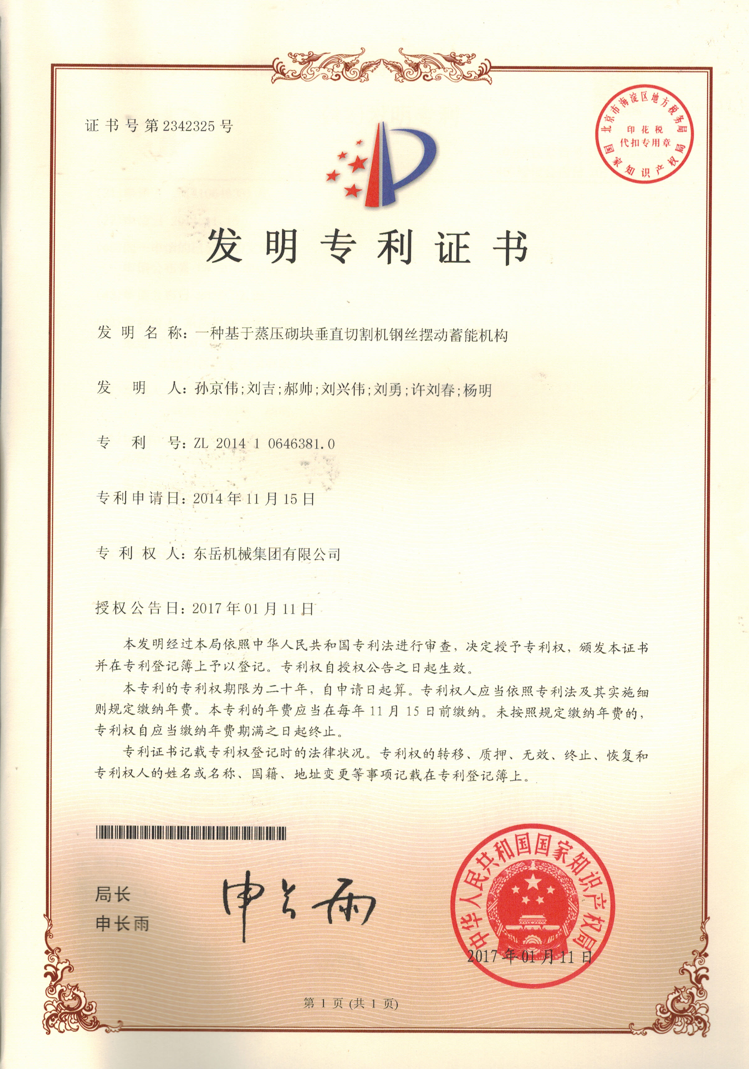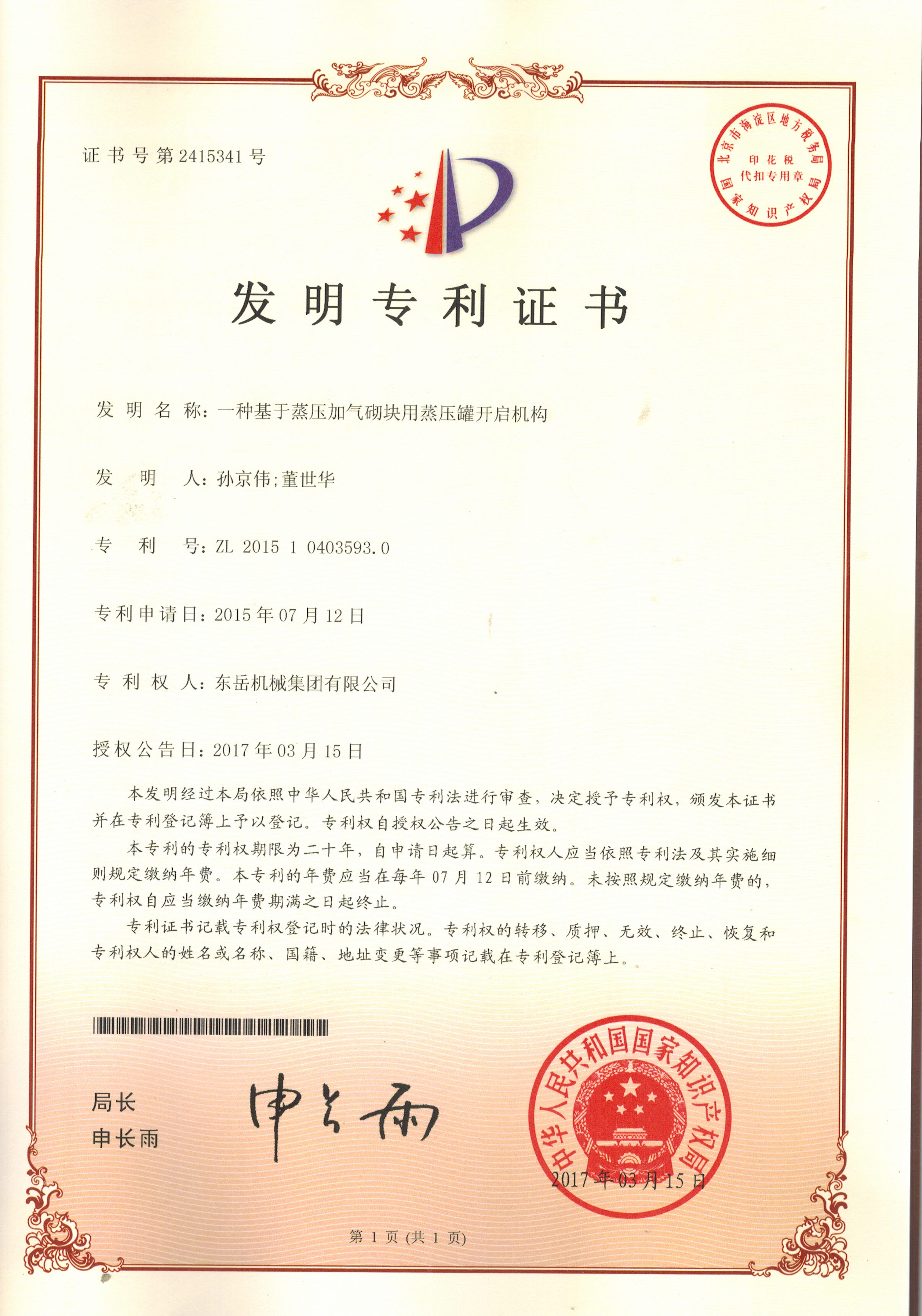 發(fā)明專利證書